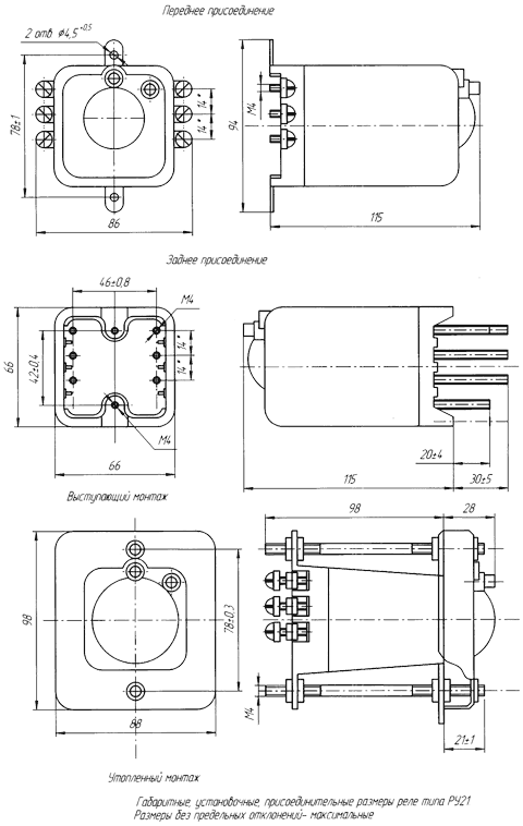 Реле РУ21-1 выпускаются с двумя замыкающими контактами и дополнительным контактом с самовозвратом. Время срабатывания контакта с самовозвратом не более 15 мс.