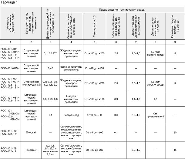 Назначение:Датчики-реле уровня РОС-101(И), РОС-102(И) (в дальнейшем датчики-реле) предназначены для контроля одного уровня (РОС-101) или 2-х (РОС-102) независимых предельных уровней электропроводных и неэлектропроводных жидкостей, твердых (кускообразных) сред, зерна и продуктов его размола, а также раздела сред: вода - светлые нефтепродукты, сжиженные углеводородные газы - вода и других жидкостей с резко отличающимися диэлектрическими проницаемостями. В датчиках-реле с помощью регулирующих элементов в передающем преобразователе обеспечивается установка уровня и дифференциала срабатывания в пределах рабочей зоны чувствительного элемента, с помощью изменения положения перемычки обеспечивается изменение вида сигнализации "наличия" или "отсутствия" контролируемой среды, с помощью элементов световой индикации обеспечивается контроль функционирования и индикация достижения устанавливаемого уровня. Датчик-реле состоит из первичного преобразователя (ПП) с чувствительным элементом и передающего преобразователя (ППР). Технические данныеУсловные обозначения, конструктивное исполнение чувствительного элемента, параметры контролируемой среды указаны в таблице 1.